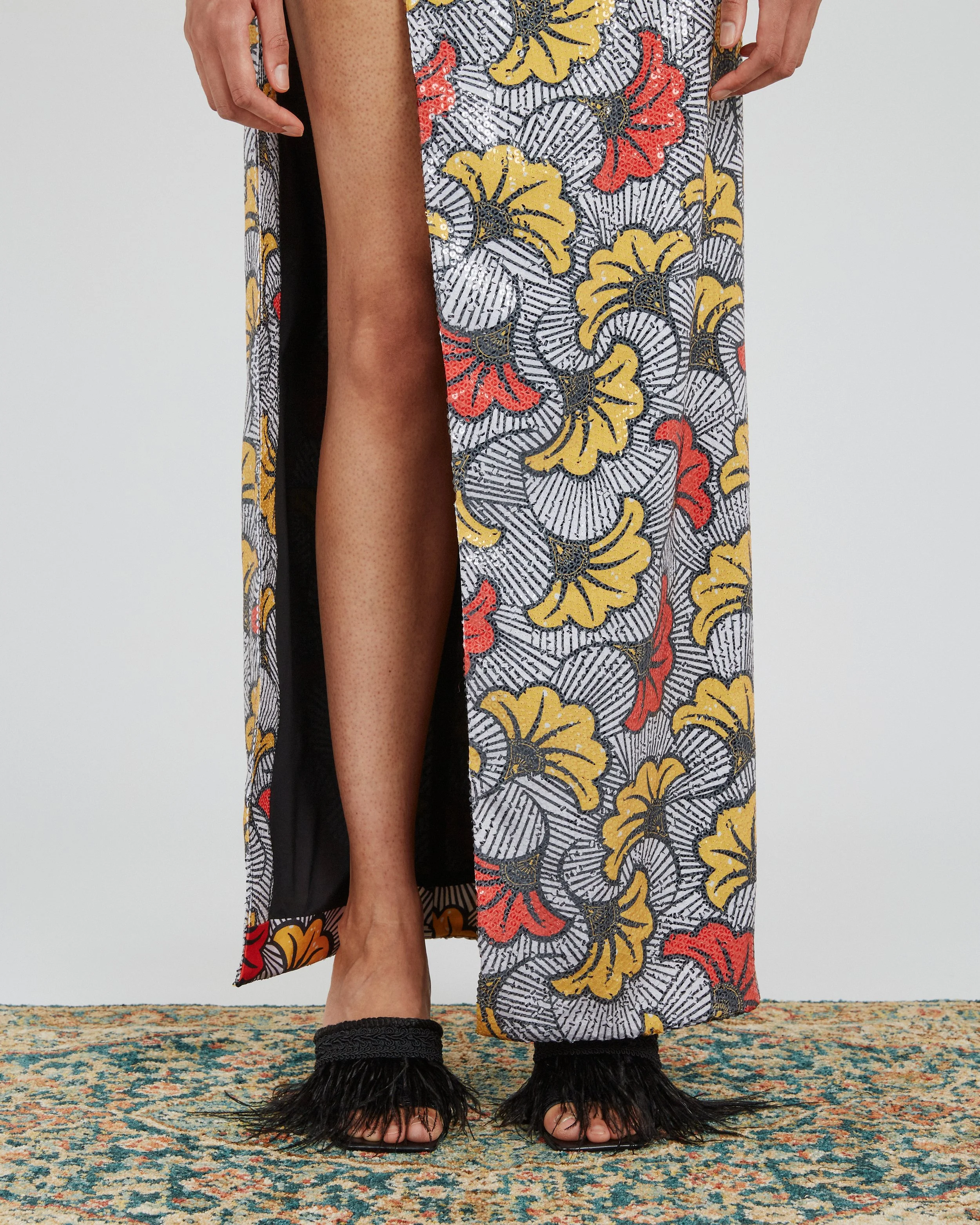 Sani Dress“Radience”Dress is made FROM PRINTED SEQUIN FABRIC. ANGLED CUT OUT AT WAIST AND SUPER HIGH FRONT LEG SPLIT.